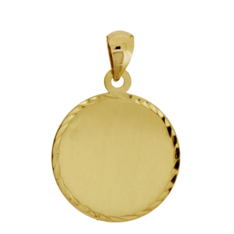 Rund berlock, smycke i äkta guld 18 karat med blanka glittrande fasetter på kanten. Ytterdiameter 15 mm.
