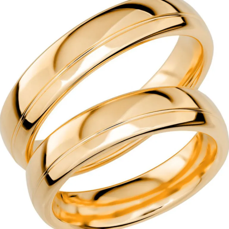 Slät kupad guldring i vanligt guld med spår runt hela ringen, rödguld, i en hög kraftig modell som förlovningsring eller vigselring. Sign of love SR1006 från Schalins ringar.
