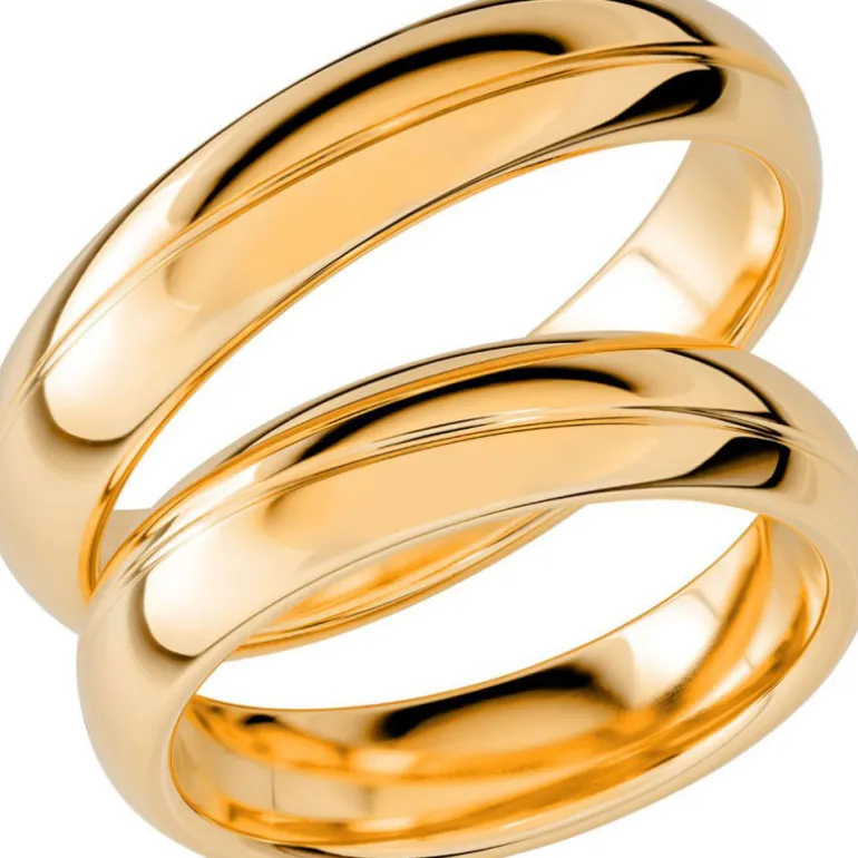 Förlovningsring och vigselring, slät med ett graverat spår snett runt ringen i vanligt guld 18 karat, Sign of love SR1027 tillverkad av Schalins ringar.