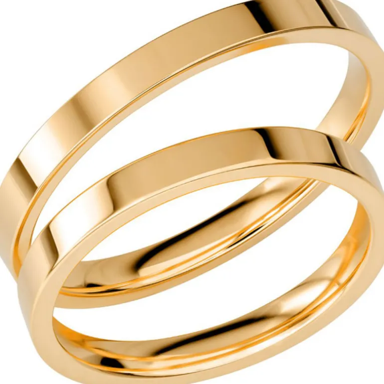 Smal helt slät flack rak förlovningsring och vigselring i vanligt guld, Sign of love SR1037 tillverkad av Schalins ringar.