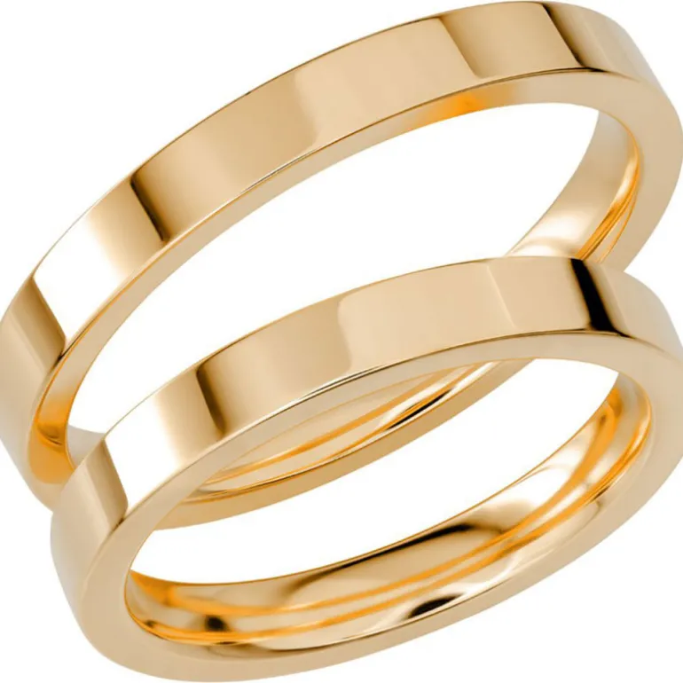 Slät flack rak förlovningsring och vigselring i vanligt guld, Sign of love SR1038 tillverkad av Schalins ringar.