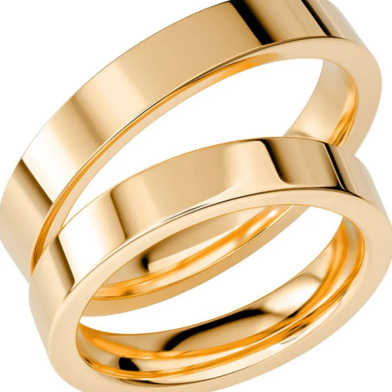 Slät rak helt flack och hög guldring till förlovning och vigsel. Tillverkad i vanligt guld 18 karat, så kallat rödguld, av Schalins ringar. Sign of love SR1040.