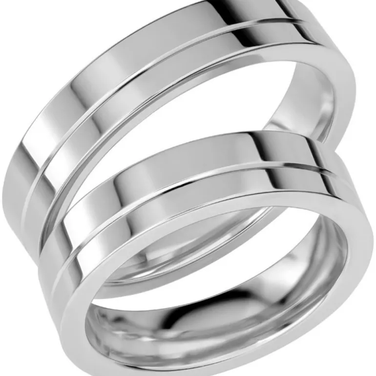 Rak flack och hög vitguldsring med graverat spår i mitten, Sign of love SR1041. Guldring till förlovning och vigsel tillverkad i vitt guld 18 karat av Schalins ringar.