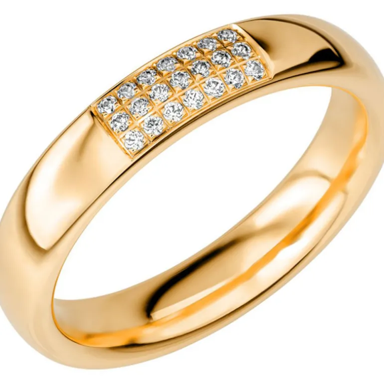 Mjukt välvd och kraftig guldring med diamanter på tre rader som bildar en rektangel.