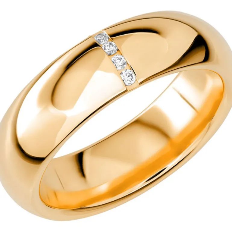 Sign of Love, hög och bred guldring med fyra diamanter i ett spår i mitten. Mjukt kupad ring både utvändigt och invändigt.