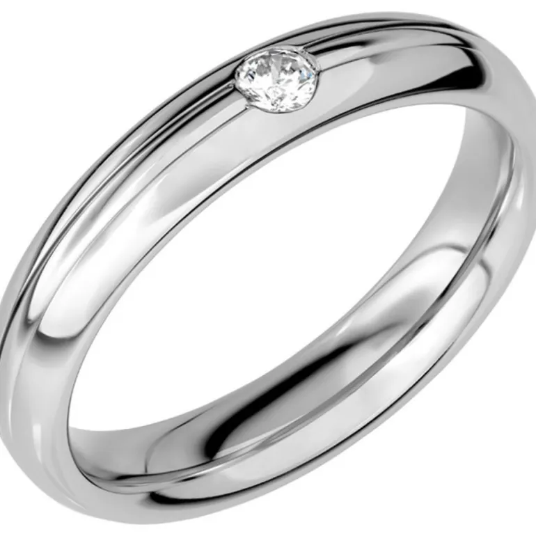 Sign of Love, rund kupad ring i platina med spår i mitten och diamant.