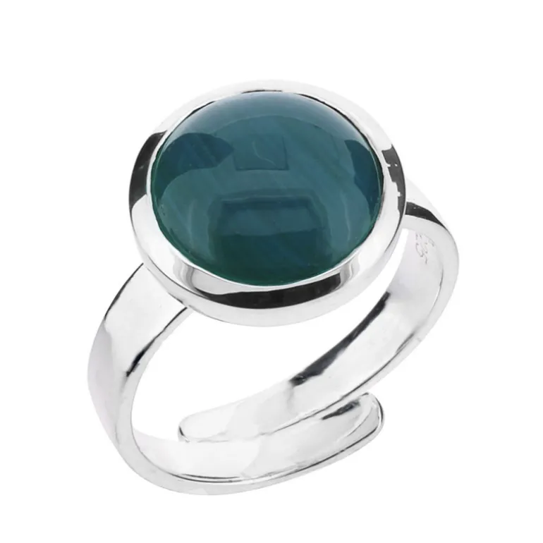 Silverring med blå sten, slaggsten, en restprodukt från järnframställning som skiftar i allt från ljusblått till mörkblå.