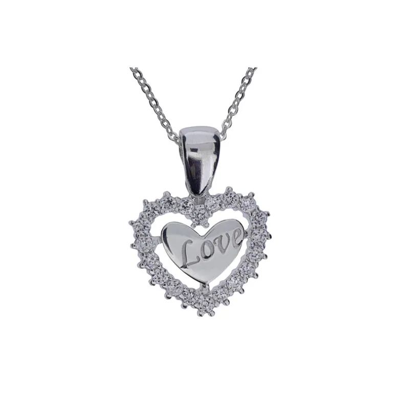 Kärlekshjärta med texten Love och vita stenar, så kallade cubik zirkoner, på vacker kedja.