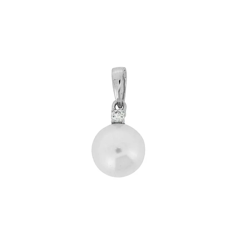 Smycke med vit pärla, vit glittrig sten med ögla i vitguld 18 karat guld.
