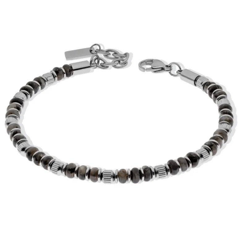 Stålarmband Zeke, stål och slipade stenar i olika grå nyanser. Bredd 4,5 mm. Justerbar i längd 19-22 cm.