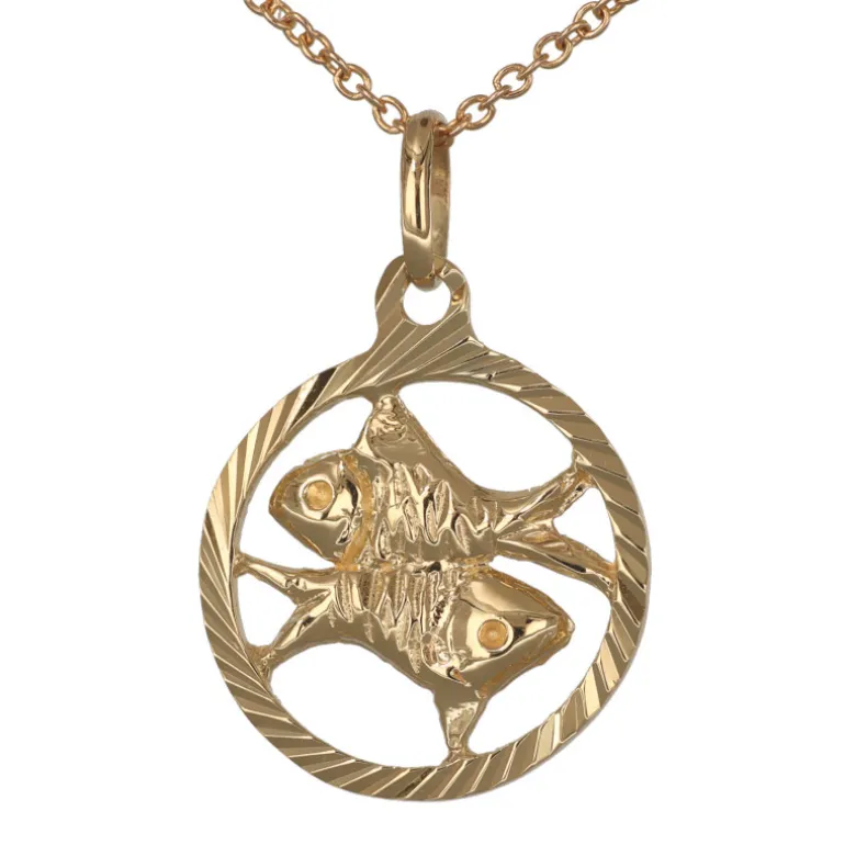 Stjärntecken halsband fiskarna i äkta guld 9 karat. Smycket och kedjan är tillverkat i 9 karat guld, det vill säga en blandning av 37,5 % guld och resten silver och koppar. Ytterdiameter 14 mm, höjd inklusive ögla 21 mm. Kedja modell ankar, bredd 0,6 mm artikel 9-50-0001. Det kan skilja lite inom astrologin, men om du är född mellan 19 februari och 20 mars är du född i fiskens tecken.