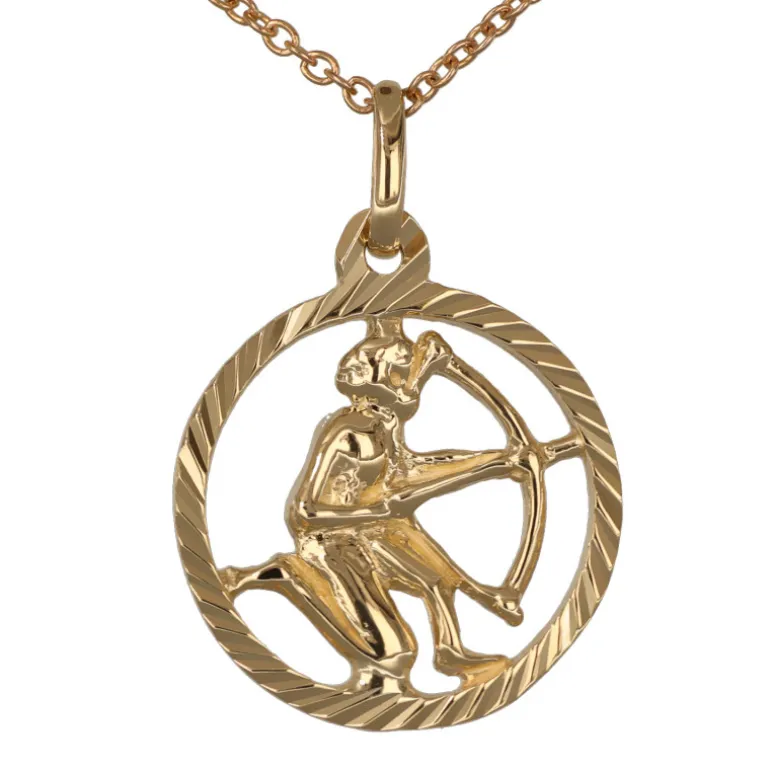 Stjärntecken halsband skytten i äkta guld 9 karat. Smycket och kedjan är tillverkat i 9 karat guld, det vill säga en blandning av 37,5 % guld och resten silver och koppar. Ytterdiameter 14 mm, höjd inklusive ögla 21 mm. Kedja modell ankar, bredd 0,6 mm artikel 9-50-0001. Det kan skilja lite inom astrologin, men om du är född mellan 23 november och 21 december är du född i skyttens tecken.