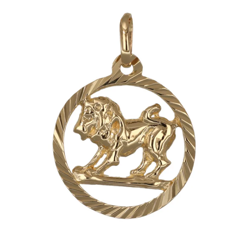 Stjärntecken lejon, smycke i äkta guld 9 karat. Smycket är tillverkat i 9 karat guld, det vill säga en blandning av 37,5 % guld och resten silver och koppar. Ytterdiameter 14 mm, höjd inklusive ögla 21 mm. Det kan skilja lite inom astrologin, men om du är född mellan 23 juli och 23 augusti är du född i lejonets tecken.