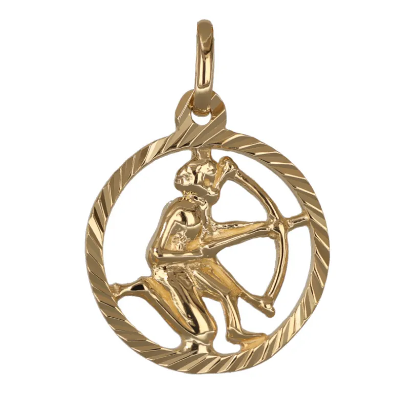 Stjärntecken skytten, smycke i äkta guld 9 karat. Smycket är tillverkat i 9 karat guld, det vill säga en blandning av 37,5 % guld och resten silver och koppar. Ytterdiameter 14 mm, höjd inklusive ögla 21 mm. Det kan skilja lite inom astrologin, men om du är född mellan 23 november och 21 december är du född i skyttens tecken.