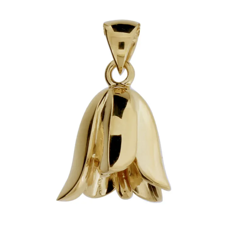 Smycke med stor blåklocka, ängsklocka, fantastiskt vackert smycke med Dalarnas landskapsblomma och även framröstad som Sveriges nationalblomma i äkta guld 18 karat. Höjd inklusive ögla 21 mm.