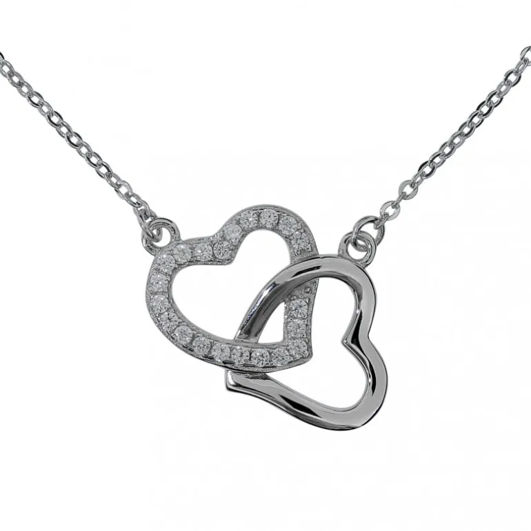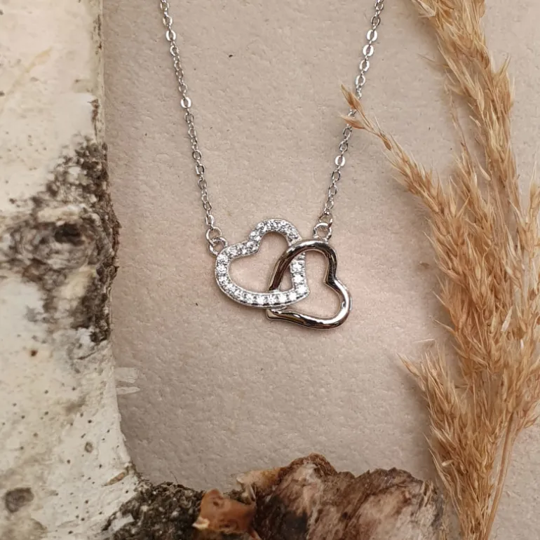 Halsband med två hjärtan, silverhjärtan, som sitter tillsammans, den ena med glitterstenar. Äkta silver 925.