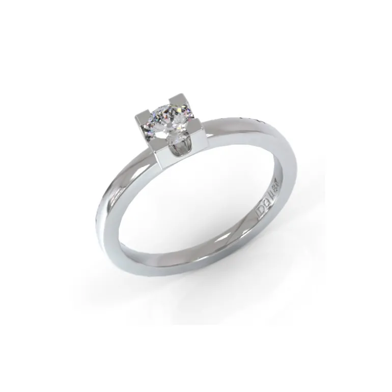 Enstensring, solitär, ring med en diamant infattad i stilren fattning på en ring med svag kupning.