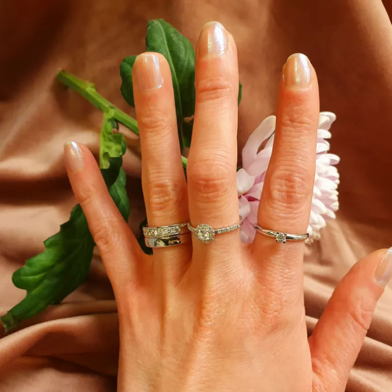 Förlovningsring och vigselring vitguld 18 karat, bredd 4,0 mm och höjd 1,9 mm.