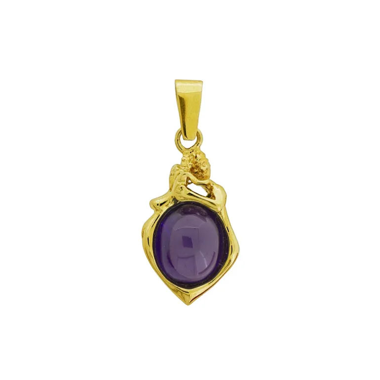 Smycke i 18 karat guld med en kvinnokropp och en manskropp samt en lila sten 10*12mm.
